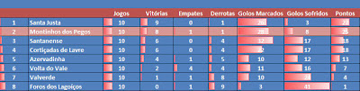 nhos dos Pégos recebeu a equipa do Santa Justa, segundo e primeiro classificados em confronto directo. Um jogo importante para as duas equipas, com a equipa da casa com a possibilidade de encurtar distancias para os adversários.Desde o inicio a equipa dos MP foi a mais atrevida, com uma sequência de boas combinações a meio campo, foi sendo a equipa mais objectiva na busca do primeiro golo do encontro. Esse golo acabou por surgir por intermédio de Ferreira, no seguimento de uma jogada iniciada por João Gonçalves que com um passe desmarcou Frade, que desviando a bola do guarda-redes colocou-a ao alcance de Ferreira, que não desperdiçou. Nos minutos seguintes a registar uma reacção do SJ, que teve como ponto central um lance na área dos MP, com a equipa a pedir penalti, mas a equipa de arbitragem a não concordar, mandando prosseguir o jogo.